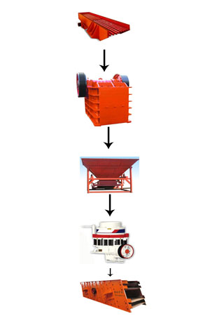 ZSW-420X110喂料機均勻給料到PE750X1060顎式破碎機中,初破后到ZSW120*150料倉喂料機,由料倉均勻給料到HB155圓錐破碎機中二破,然后直接輸送到SZZ-3-2260振動篩篩分,不合格的石料再回到圓錐破碎機中再次破碎。