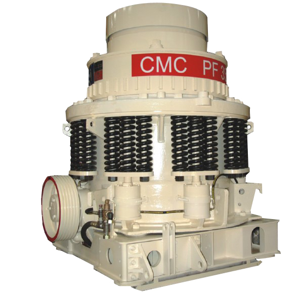 在工作時,由電動機通過三角帶、大帶輪、傳動軸、小錐齒輪、大錐齒輪帶動偏心套旋轉,破碎圓錐軸心線在偏心軸套的迫動下做旋轉擺動,使得破碎壁表面時而靠近 又時而離開軋臼壁的表面,從而使物料在定錐與動錐組成的環(huán)形破碎腔內不斷地受到?jīng)_擊、擠壓和彎曲而破碎。經(jīng)過多次擠壓、沖擊和彎曲后,物料破碎至要求粒度,經(jīng)下部排出。
